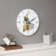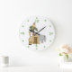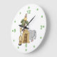Cute kid's wall clock with cartoon like graphics of safari animals next to a palm tree and grass hut. Numbers and dots representing hours are in green. Great looking clock that will add a decoration to your child's room.
