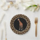 Super cute wild animal themed design is perfect for you wild animal or safari themed birthday party. Design features a giraffe animal print background. In the center is a black circle with white trim. In the center of the circle is a graphic of a cute spotted giraffe. This giraffe design on a plate coordinates perfectly with our Young Wild and Three! Giraffe Safari Birthday Party invitations.