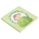A gallery wrap with a cartoon illustration of a little monkey peeking out from behind a green bush. Surrounded by a wreath of tropical leaves. Set on an olive green watercolor background.