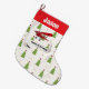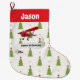 Design features a cute Santa as a Pilot flying a red airplane carrying a name banner. The stocking has green Christmas trees as a background. There's a customizable option to add the child's name to the top of the boot and the banner on the airplane. This would be perfect for that little aviator!