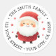 Round Santa Claus return address labels featuring a watercolor illustration of Santa with rosy cheeks, fluffy beard, and classic red suit, surrounded by red stars. Your personalized name and address encircles the Santa in a whimsical serif font with dot dividers. Perfect for Christmas cards, invitations and thank-you notes.