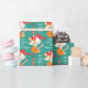 An adorable little brown fox wears a Santa hat and holds a candy cane on this Holiday wrapping paper for kids. Beside the fox hang red mittens, and the text "Ho Ho Ho" is in white. Between the repeated fox images are two text fields for you to personalize. Everything is placed on a teal green background. Cute for any child, especially grandchildren.