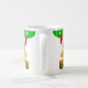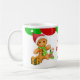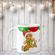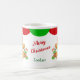 On this cute Christmas mug, a little gingerbread man brings a stocking and a brightly wrapped gift package. He wears a green and white polkadot scarf and a red Santa hat. The image is printed twice on the mug, with your child's name in green at the center, along with a bright red greeting. The top of the mug is bordered in green and red scallops. Fun for kids of all ages!