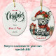 On the front of this cute kids' Christmas ornament is an adorable baby zebra sitting next to his gifts. He wears a red and white pattern Santa hat and matching scarf. Your custom name is at the bottom. The back of the ornament has a Merry Christmas message and your signature. AI generative content.