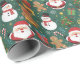 Premium wrapping paper with a whimsical repeating pattern of jolly Santas, snowmen, gingerbread men, Christmas trees, gifts, and candy canes on a festive green background—perfect for joyful holiday gift wrapping.
