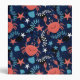 Cute sea pattern with crabs. Orange crabs, starfish, blue shells and algae on a dark blue background.