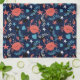 Cute sea pattern with crabs. Orange crabs, starfish, blue shells and algae on a dark blue background.