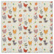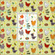 A cute cartoon drawing of 6 popular chicken species: Barred Rock, Buff Orpington, White Silkie, Rhode Island Red, Silver laced Polish crested, Frizzle Cochin Bantam with pink and blue flowers, corn cobs, watermelons and suns.