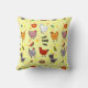 A cute cartoon drawing of 6 popular chicken species: Barred Rock, Buff Orpington, White Silkie, Rhode Island Red, Silver laced Polish crested, Frizzle Cochin Bantam with pink and blue flowers, corn cobs, watermelons and suns.