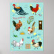 A cute cartoon drawing of 6 popular chicken species: Appenzeller Spitzhauben, Milli Fleure bantam, Phoenix, Rhode Island Red, Serama, Sussex with pink worm, wooden fence, wheat grain plant, standing grandfather clock, green grasshopper and rising sun, with text saying: Cock-A-Doddle-Doo.