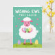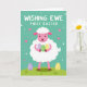 This card shows a stylized sheep centered on the front, with a fluffy white coat and a bright fuchsia face, ears, and slim legs, standing on rolling green grass beneath a teal spring-sky background 🌷. The sheep’s wide eyes and small curved smile create a friendly, affectionate look, like it’s sharing a quiet moment with someone special. Tucked gently in its front legs are three pastel eggs, held close as if they’re a small gift meant for a friend. The eggs are colored soft lavender, lime green, and sunny yellow, each decorated with simple patterns that add extra detail without crowding the scene 🐰. Two more decorated eggs sit in the grass in the lower foreground, spaced apart to suggest a little trail. Near the top, rounded white lettering is placed across the teal area in a clear, easy-to-read line. Scattered around the upper background are small pink hearts and tiny starburst sparkles floating above the sheep.