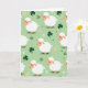 This design shows a repeating meadow scene filled with chubby cartoon sheep drifting across a light spring-green background 💚. Each sheep has fluffy white fleece, a soft peach face, tiny black dot eyes, and a small curved smile that feels like a friendly glance shared between close companions. Dark green shamrocks ☘️ are scattered between them, like little tokens the sheep seem to be gathering for one another as they wander. Small flowers in white, pale pink, and soft orange dot the space, adding gentle color like a field where pairs might linger side by side. There’s no headline text on the design, keeping the pattern open and airy with the imagery doing all the talking. The light is soft and even, making the white wool stand out against the green and the darker shamrocks. Every so often, a tiny blue cloud-like puff appears near a sheep’s tail, tucked into the pattern like a small surprise.
