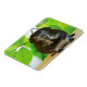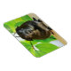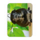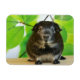 Photograph of a cute silver fox guinea pig against green tree leaves.