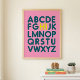 Fun, playful typography design of the Alphabet in Bright Fuchsia Pink and Teal Blue with the H and the I in Lemon Yellow