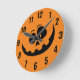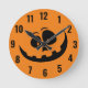 This charming jack-o'-lantern face clock is perfect for adding a festive Halloween touch to your space. Featuring a classic happy pumpkin face in black and orange with bold black numbers, it combines playful design with practicality. Customize the background color to match your Halloween theme. Cute Happy Halloween Pumpkin Face Jack O' Lantern Round Clock.