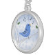 Musical notes float above the head of a cute little blue bird that is singing happily in a tree against a swirly blue sky in the original mixed media digital painting on this necklace.