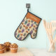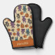 Add a cute touch to any kitchen this Halloween with this oven mitt that's ready to be personalized with a name. It features a pattern of cute stuffed animals with part of their skeletons showing along with patchwork style pumpkins.