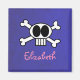 Pirate themed cool, cute and funny graphic illustration of skull and crossbones. A white skull with big black eyes and long white teeth. Personalize with a name. Purple background.
