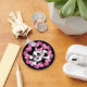 Cute skull and crossbones with polka dotted bow surrounded by pink hearts and flowers.