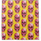 Cute skull pattern shower curtain with a cartoon illustration of a funny pink skull with rosy cheekbones and two cute ghosts in its eye sockets watching each other and smiling, little adorable spider standing on top of one of these spooky friends. This fun macabre design has bright psychedelic, trippy pink and yellow colors.