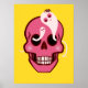 Cute skull poster with a cartoon illustration of a funny pink skull with rosy cheekbones and two cute ghosts in its eye sockets watching each other and smiling, little adorable spider standing on top of one of these spooky friends. This fun macaber design has bright psychedelic, trippy pink and yellow colors.