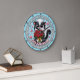 This circular wall clock features a charming, cartoon-style illustration of a cute baby skunk holding a bouquet of red roses. The skunk has large purple eyes and the classic black and white coloring. The scene is set against a bright, light-blue background and framed by an ornate silver-colored filigree border, giving it a dimensional look. The background also contains floating pink hearts and arrows. Bold red text across the bottom reads "LOVE IS IN THE AIR!". The entire design is a highly detailed print, and the silver border is not real metal.