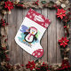 This Holiday stocking for a little girl features an image of an adorable penguin dressed in a pink and maroon scarf and Santa hat, and riding on a sled. Behind the penguin image is a colorful watercolor abstract splash design in blue, aqua and lime green. A matching maroon pink and white snowflake pattern border is at the top and at the toe. Your child's name is on a pink lined white banner on the top snowflake pattern border. The back of the stocking is the same dark pink and white snowflake pattern.