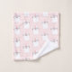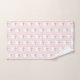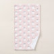 Bathroom towel set with a cute pattern of sleeping kitty cats looking peaceful and happy. On a pink background.