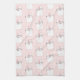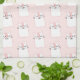 A kitchen towel with a cute pattern of sleeping kitty cats looking peaceful and happy. On a pink background.