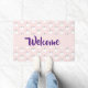 A welcome doormat a cute pattern of sleeping kitty cats. On a pink background.
