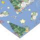 An adorable little snowman sleeps with a smile on his face beneath a decorated Christmas tree in the repeated pattern on this festive table runner. Predominant colors used are green, red, and yellow. The pattern is placed on a medium blue background.