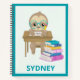 Cute artwork featuring an adorable sloth wearing glasses sitting at a school desk solving a math problem and a pile of books.