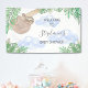 This cute baby shower banner is decorated with a watercolor of a sweet baby sloth hanging from a branch, framed with green jungle leaves and blue clouds.