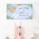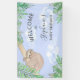 This cute baby shower banner is decorated with a watercolor baby sloth hanging from a branch, framed with green jungle leaves and a blue background.