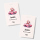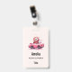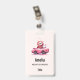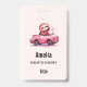 Name badge with an adorable illustration. A happy looking sloth sitting in a sporty pink convertible. Waving as he drives by. With hearts floating upwards.