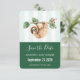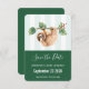 Save the date card with an adorable sloth hanging upside down from a tree branch. Tree branch is decorated with tropical leaves and berries.