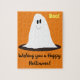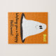 This smiley ghost is wishing all the kids a happy Halloween! It's going to be all treat and no tricks here. Large white ghost on orange background with cute little smile. Lettering of message below is in black, and the ghost is saying Boo in bright yellow letters. Save the puzzle to do on Halloween itself, or enjoy doing this puzzle in the days leading up to the holiday to build excitement, or after as you slowly work down your candy collection. Fun for kids together or the whole family.