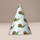 Cute kids birthday party hats with an pattern of a green snail. Illustration and design by Patricia Alvarez.