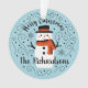 A cute Christmas snowman with the words Merry Christmas decorates this ornament. Personalize it with your family name. A fun accent for the Christmas holiday season. Designed for you by Blackberry Boulevard.
