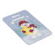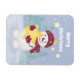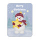Cute Christmas illustration with snowman in hat and scarf holding a star drawn in cozy pastel blue mint and plum colors and features winter themes like holydays, snow, spruce tree, snowman.