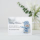 A postcard with a cute photograph with a little snowman. Standing outside in the winter with snow falling all around. This cute little guy is dressed up in blue knitted outdoor clothing. Some white/gray bokeh flare in the background.