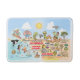 Bright and colorful scene offers a spectacular view of Southern California - wacky characters frolic on the beach and desert of SoCal showcasing Los Angeles, San Diego, Orange County, Santa Barbara, Riverside, Palm Springs, Anza Borrego and Joshua Tree parks as well as the border cities of Tijuana, Tecate and Mexicali. This charming scene has it all – a surfer hangs ten while a killer whale leaps out of the water, zoo animals greet the tourists, a muscular dude flexes his pecs as a T-Rex roars a challenge and a tank moves into position and much more…
