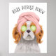Funny and motivational art poster featuring a hand painted illustration of a King Charles Spaniel Dog getting a facial with a pink headband and cucumber slices. The text at the top says "relax, refresh, renew." Perfect for a spa or your living room.