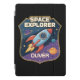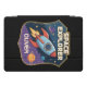 This playful personalized ipad cover features a bold space explorer badge. In the center of the badge is a playful cartoon rocket soaring through space with planets orbiting around it.