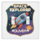 This personalized light switch cover features a bold and vibrant space explorer badge. In the center of the badge is a playful cartoon rocket soaring through space with planets orbiting around it.