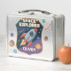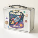 This playful personalized metal lunch box features a bold and vibrant space explorer badge. In the center of the badge is a playful cartoon rocket soaring through space with planets orbiting around it.