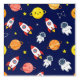 Blast off into a world of wonder with this adorable space-themed pattern perfect for little dreamers. Cheerful smiling planets in bright yellow, orange, pink, and peach float alongside red rockets zooming through the stars, cute floating astronauts, twinkling yellow stars, and constellation lines on a deep navy blue background. The playful, cartoon style and vibrant colors create a joyful, imaginative mood that's out of this world.