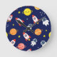 Blast off into a world of wonder with this adorable space-themed pattern perfect for little dreamers. Cheerful smiling planets in bright yellow, orange, pink, and peach float alongside red rockets zooming through the stars, cute floating astronauts, twinkling yellow stars, and constellation lines on a deep navy blue background. The playful, cartoon style and vibrant colors create a joyful, imaginative mood that's out of this world.