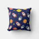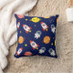Blast off into a world of wonder with this adorable space-themed pattern perfect for little dreamers. Cheerful smiling planets in bright yellow, orange, pink, and peach float alongside red rockets zooming through the stars, cute floating astronauts, twinkling yellow stars, and constellation lines on a deep navy blue background. The playful, cartoon style and vibrant colors create a joyful, imaginative mood that's out of this world.