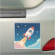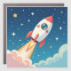 Cute red and white rocket blasting off in space with whimsical stars and clouds.